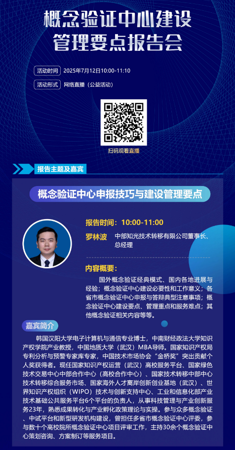 党的二十届三中全会明确指出要“加快布局建设一批概念验证、中试验证平台”,2025年政府工作报告提出要“加快概念验证、中试验证和行业共性技术平台建设”,全国各地相继出台专项政策,通过资金扶持、平台搭建、服务优化等多项举措,全面推进概念验证平台建设。为贯彻落实党中央决策部署,促进科技成果高效转化应用,我中心作为协办单位,协同国家知识产权运营(武汉)高校服务平台、中部知光技术转移有限公司共同举办“概念验证中心建设管理要点报告会”,特诚挚邀请全校师生积极参与。