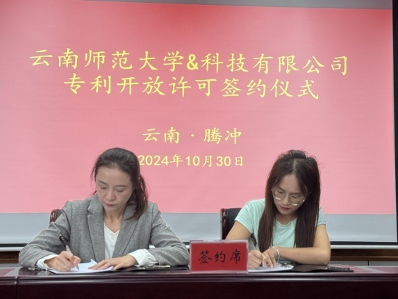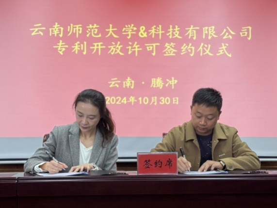 技术转移中心何苗介绍到云南师范大学是抗日战争时期西南联大留在昆明的唯一血脉,与腾冲这座英雄的城市有着深厚的情谊,学校将积极推动科技成果落地腾冲,助力企业高质量发展。随后,生命与科学学院科研团队代表苗华彪进行《基于云南省生物多样性的微生物与酶资源开发及应用》成果路演,能源与环境科学学院科研团队代表赵宏进行《太阳能蓄能干燥与制冷技术》成果路演,路演的技术引起了与会企业的浓厚兴趣,多家企业期望与我校建立长期合作关系,共同推进科研成果的转化和应用。活动现场云南师范大学与腾冲经济开发区两家企业签订了专利开放许可协议。