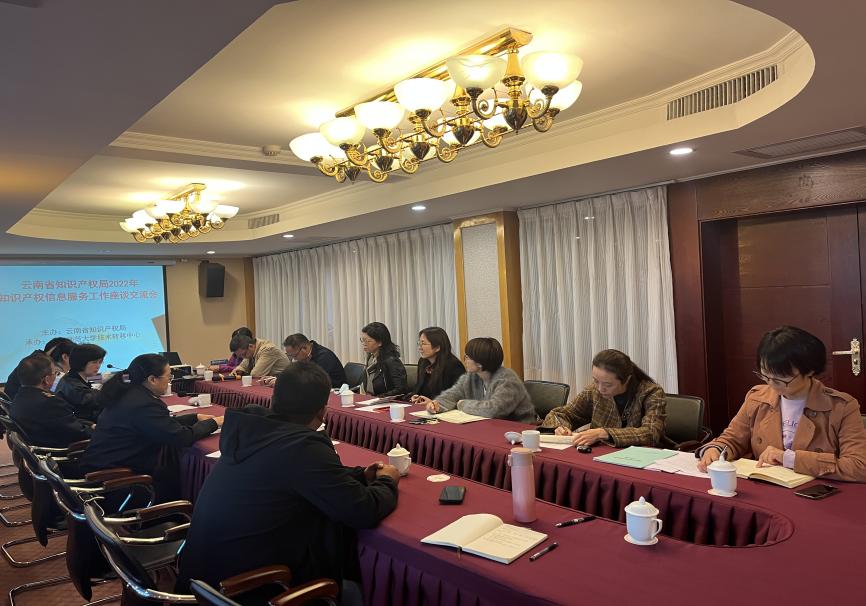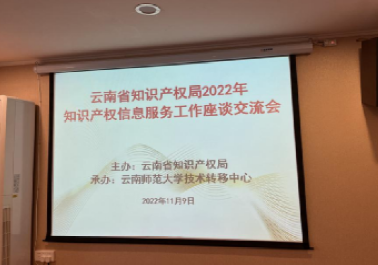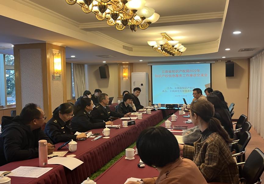 为贯彻习近平总书记关于“形成便民利民的知识产权公共服务体系,让创新成果更好惠及人民”的重要指示精神,落实省委省政府《关于贯彻《知识产权强国建设纲要(2021—2035 年)》的实施意见》《云南省“十四五”知识产权发展规划》等相关工作部署,2022年11月9日,由云南省知识产权局主办,云南师范大学技术转移中心承办,在昆明莲花宾馆召开 2022年知识产权信息服务工作座谈交流会,会议邀请云南大学、昆明理工大学、云南师范大学、云南农业大学、昆明医科大学五所高校的相关负责人及工作人员参加,参会人数共20人,会议由云南省知识产权局公共服务处陈社明处长主持。