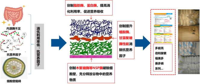(1)饲料工业方面:建立了能准确反映酶作用价值和效果的评估方法,通过精准复配、协同应用技术创制了12种饲用复合酶应用方案,提高加酶饲料转化率,减轻环境污染,其技术路线图所示