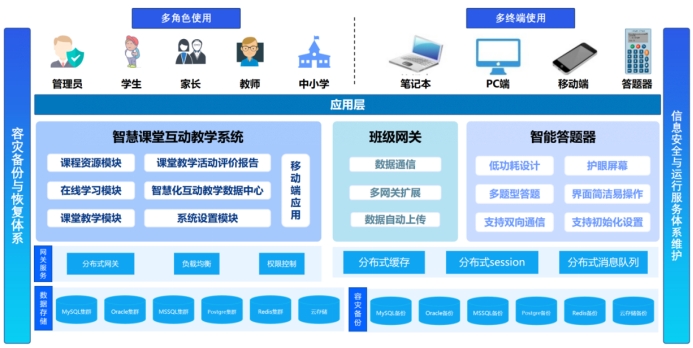 传统教学模式往往无法满足不同学生的个性化学习需求,导致教学效果参差不齐;同时,学生在传统教室环境中的参与度普遍不高,缺乏足够的互动和实时反馈,限制了他们的学习潜力发挥;此外,教育资源在不同地区、学校之间的分配不均,技术水平和教学质量存在较大差异,制约了教育公平和普及。为此,实验室研发了智慧课堂互动教学平台,以其全面的功能和技术支持,构建了一个多功能的教学环境(平台系统架构如图2所示)。平台包括基于资源管理器模式的课程资源管理平台、家校互通的全阶段在线学习平台、师生课堂实时互动及教学评价平台和智慧化互动教学数据中心等多个模块,每个模块都旨在提高教学质量和学习效果。通过集成的资源管理系统(平台功能如图3所示),教师可以高效地管理和更新课程内容,包括课本、视频、试题和其他教学资料。在线学习模块允许学生随时随地通过网页或微信小程序访问课程内容,支持互动功能如在线测试和实时反馈,从而增强学习体验。此外,智能答题和课堂互动模块激发学生的参与度和学习动力,而综合评价报告为教师和学校管理层提供了关于学生表现和课堂互动情况的详尽分析。