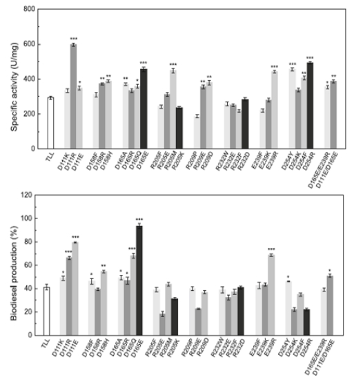 TLL带负电氨基酸突变体酶的酶比活及生物柴油转化率结果